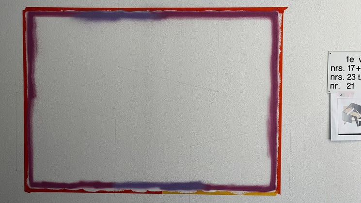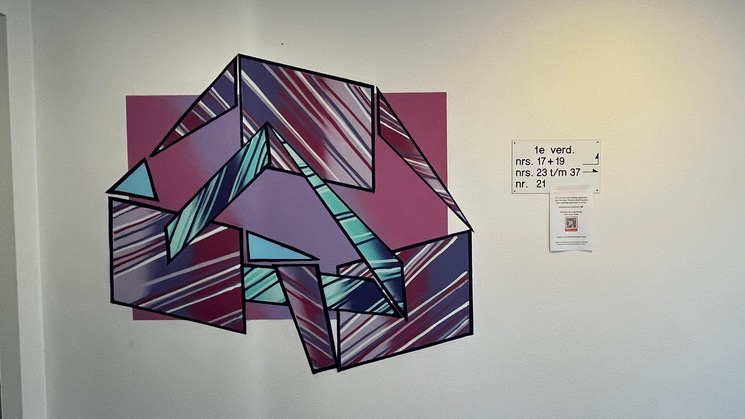 In de foto's kunt u zien hoe ik het werk opbouw. Weer eerst een vlak gemaakt. Dan een laag witte muurverf om de spuitbusverf niet op te laten zuigen door de originele oudere muurverf. Daarna wat vormen toevoegen en inkleuren. Als laatste natuurlijk de 'outline' (de buitenste lijn). Ik ben zelf erg tevreden. Wat vind u ervan?