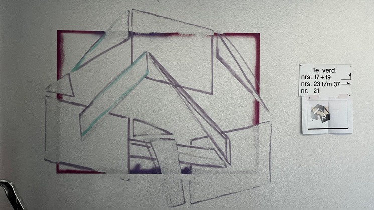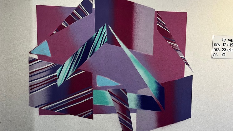 Vorige week de derde muurschildering gemaakt. Met een andere set kleuren dit keer, paarse, roze en turquoise tinten. Het was voor mij een nieuwe compositie, dus dat was leuk om te dpoen. En veel nadenken, schetsen, weer nadenken en gewoon durven doen. De achtergrond ietsje anders gemaakt. Leuk dat bewoners een praatje komen maken en even komen kijken. Heel gezellig.